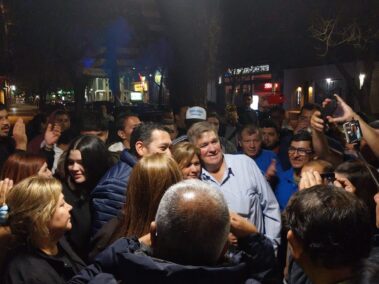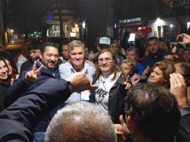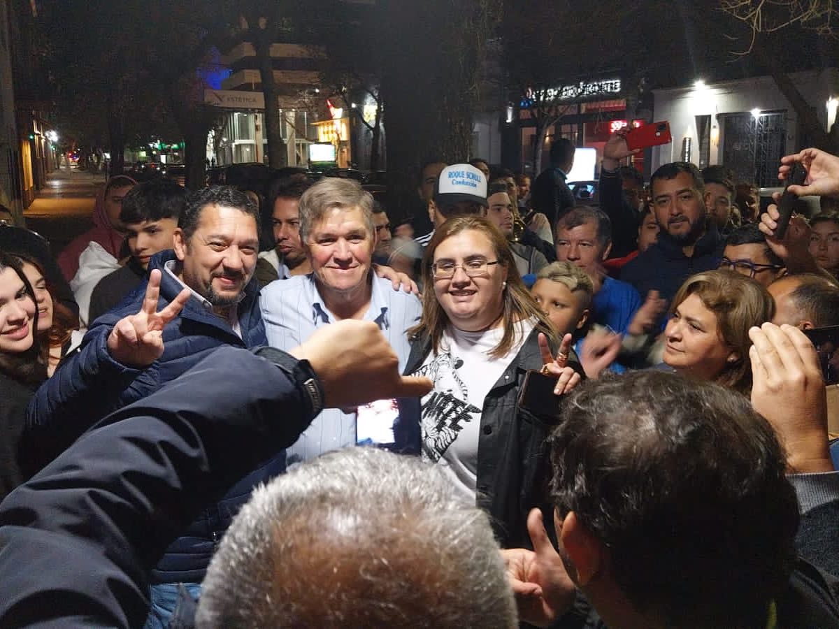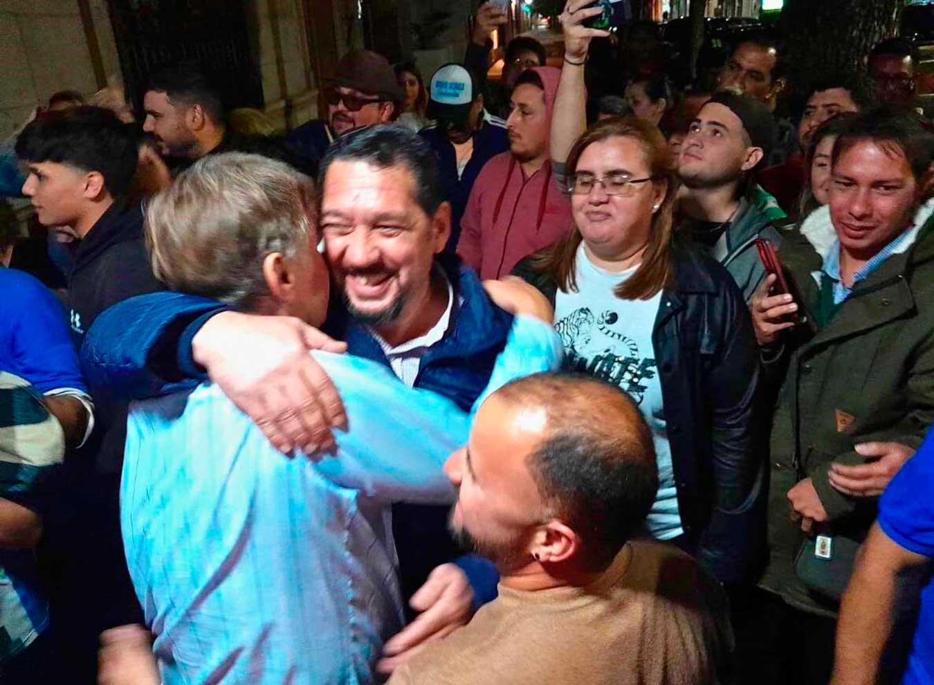 Nuestro Delegado regional, Adrián Bellomi; y Perla Portal de UPCN se acercaron a celebrar con los integrantes de la Lista Azul, una vez que terminó el escrutinio.